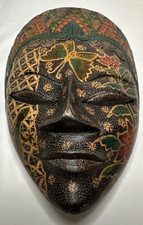 Mask in wood. A theme tribal, A mounting -> 'wall mounted' and also to a finish qualified as 'painted' and this is also this object are a vintage, For instance: painted, wooden ¬